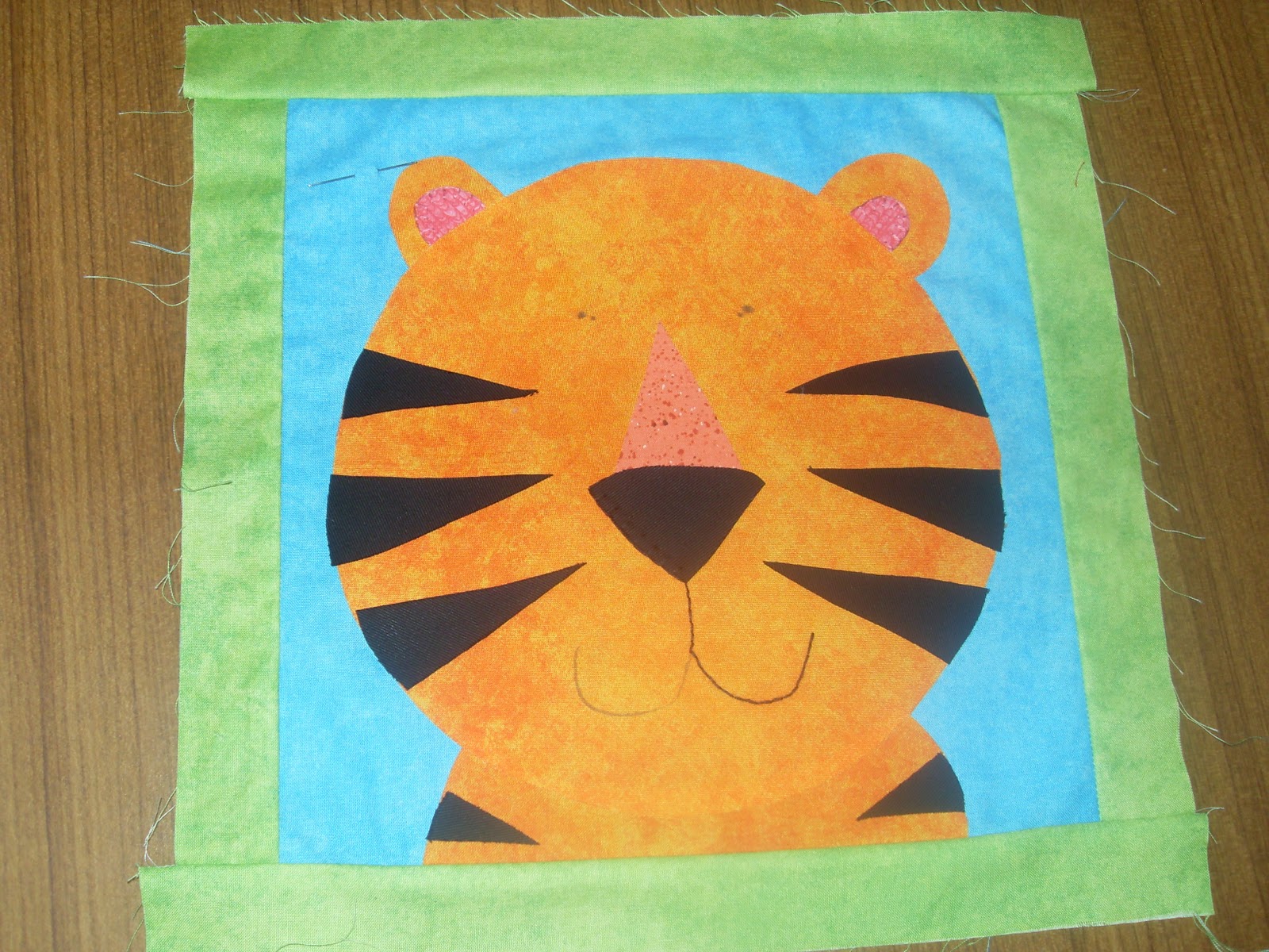the first is an update on puglet's jungle themed wall quilt.  this first picture you will recognise from last post as the centre panel of the whole quilt.